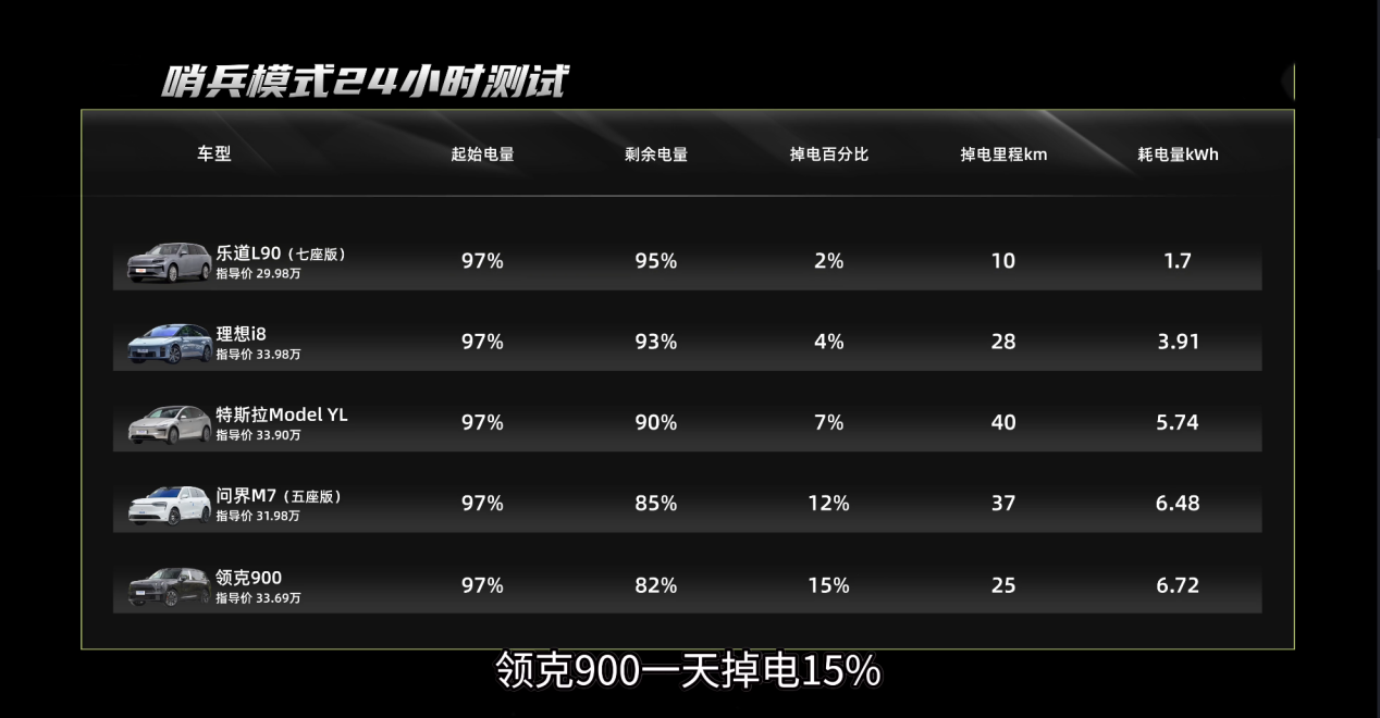 最后的项目就是大家很关心的哨兵模式到底费不费电。经过实测,领克900一天掉电15%,妥妥的“电量刺客”。而乐道L90一天掉电只有1.7kwh,真的是精打细算会过日子。换言之,领克900哨兵模式下的耗电量差不多是乐道L90的4倍。