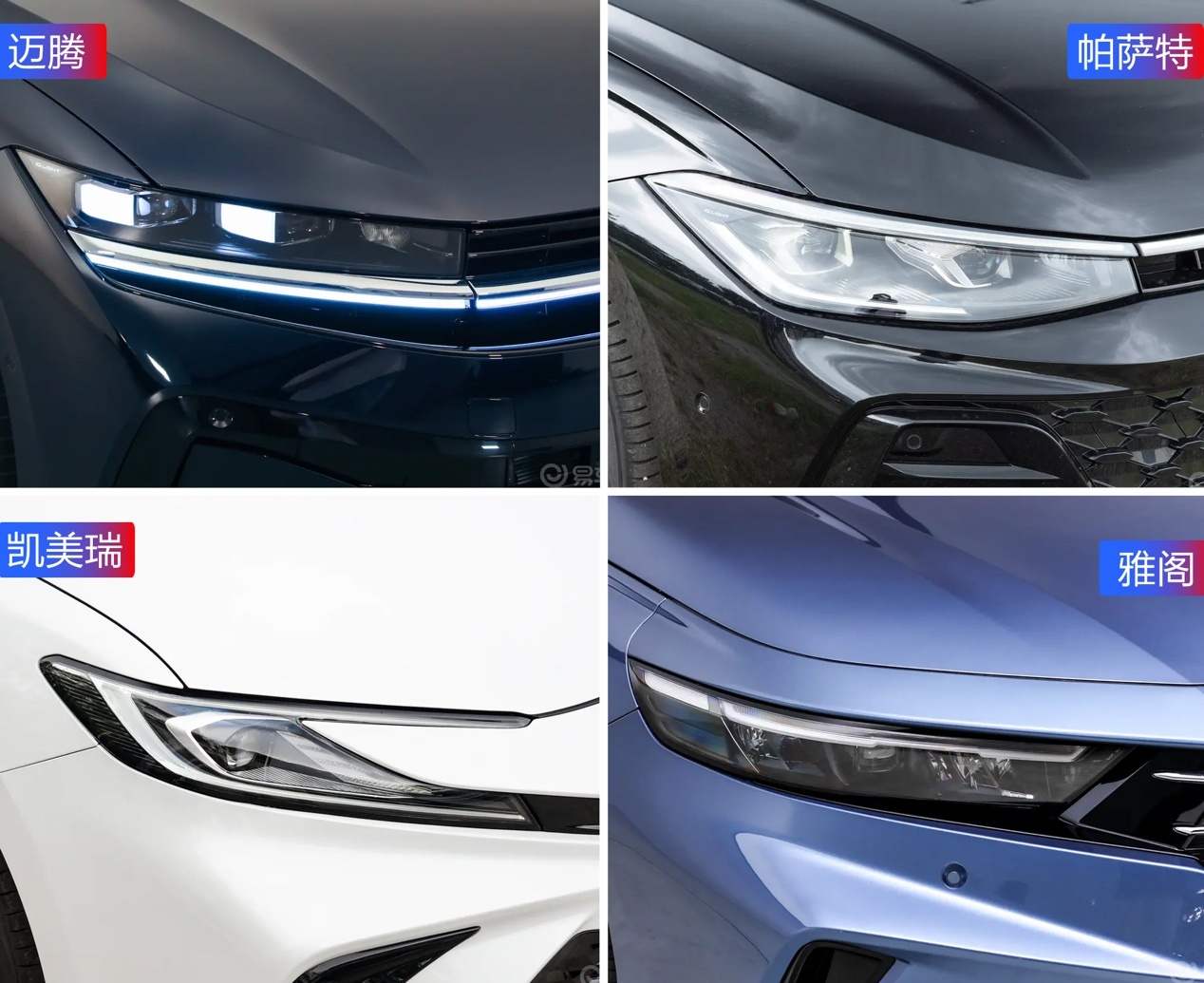 四辆车的造型设计都采用年轻化的风格,低矮、扁平是主旋律。迈腾的车头设计追求横向延展性和视觉宽度,进气格栅与大灯相连形成贯穿式灯带,视觉冲击力更强,辨识度也更高。前后LOGO在夜晚还能全部点亮,科技感和现代感直接拉满。帕萨特通过夸张的下包围造型来营造运动感,只不过和朗逸、凌渡的区别越来越小,快要分不清了。凯美瑞车头格栅区域狭长犀利,还加入了许多空力套件,在四周运动包围的烘托下,整车看上去更加低矮。雅阁的前包围造型很立体,再加上细长的头灯和点阵式格栅,整体视觉效果确实年轻了不少。