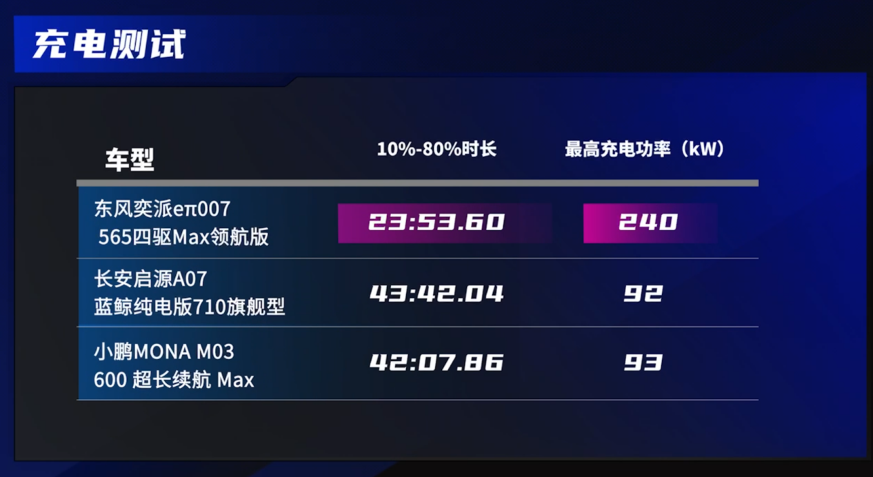 可以看到,长安启源A07用43分42秒04补充了70%的电量,小鹏MONA M03用时42分07秒86,东风奕派eπ007,用时仅23分53秒60!更重要的是,东风奕派eπ007的充电峰值功率能达到240kW,3C快充果然名不虚传,这样的表现也回答了开头的问题,即使忘记补能,在紧急情况下,东风奕派eπ007也能在短时间补上一些续航,解燃眉之急。