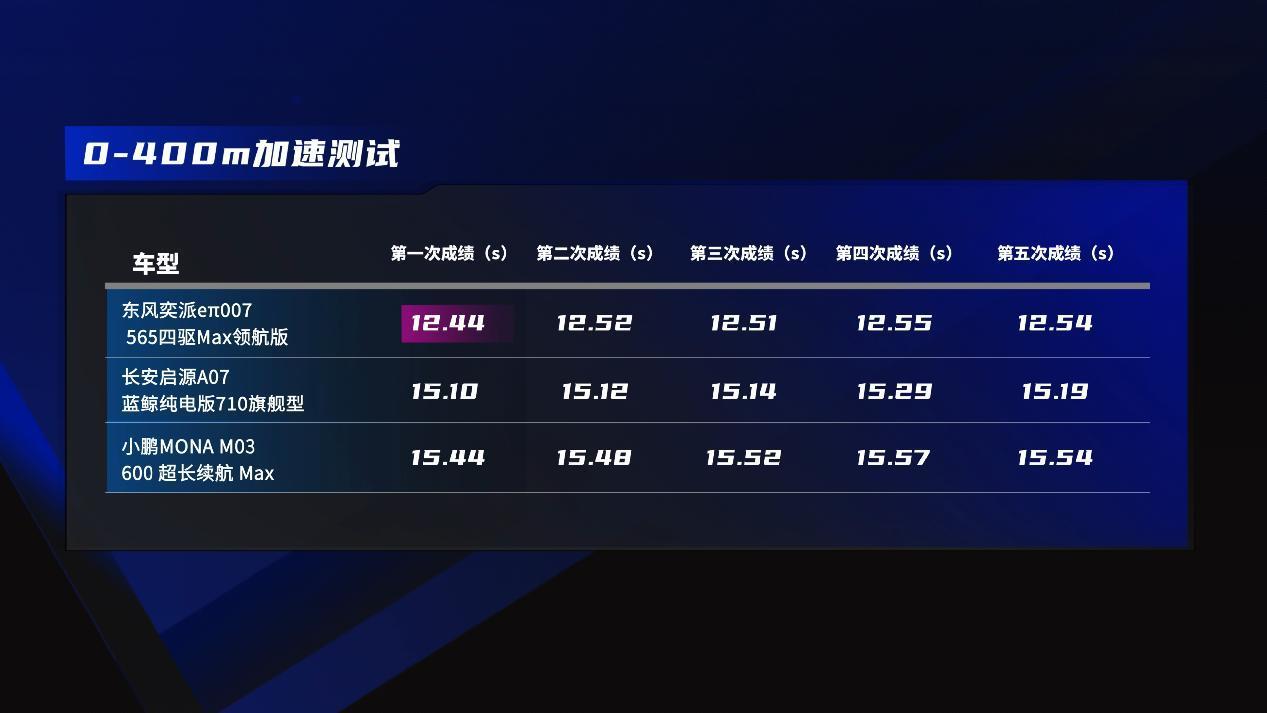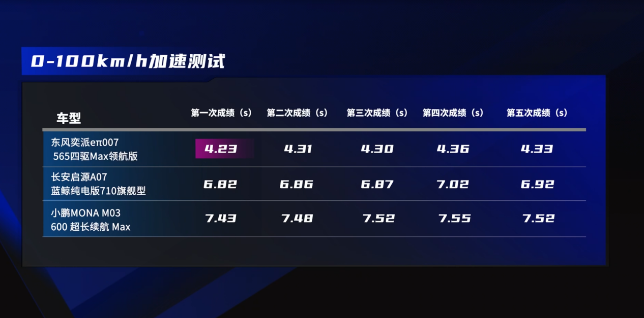 其他两台车型的加速成绩在这个价位中都达标,从技术层面来看,东风奕派eπ007双电机620N·m,相当于燃油车3.0T V6的动力,高效快速智能热管理系统+场地赛冠军团队专业调校,确实让它发挥出不俗的实力。小鹏MONA M03单电机总扭矩250N·m,长安启源A07单电机总扭矩320N·m,这两位选手的动力输出相当于2.0T车型的水平,三台车都足够优秀,结合价格和定位来看,东风奕派eπ007在动力方面的性价比更高。