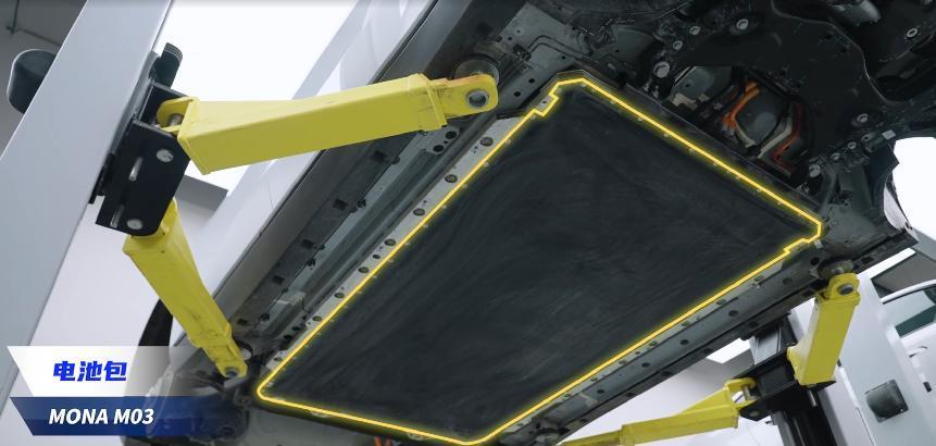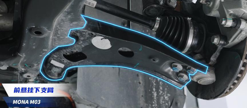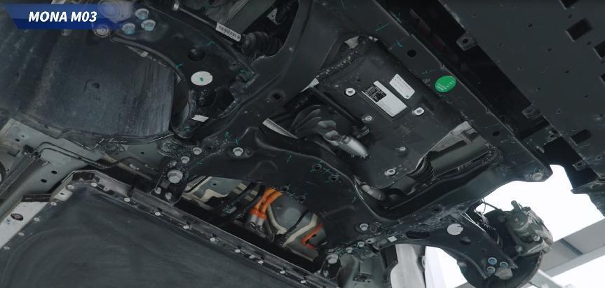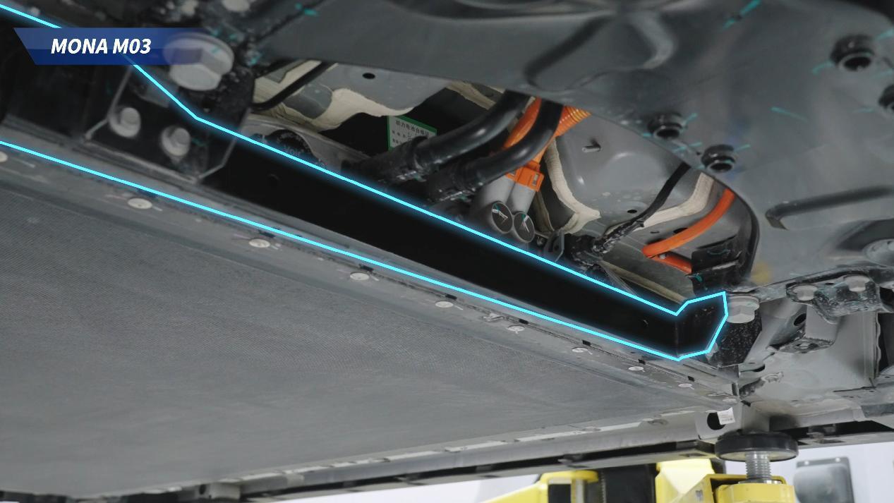 小鹏MONA M03的电池前侧有横梁防护,横梁直接连接在副车架上,左右两侧也有粗壮的防护梁,这么看防护性是很出色的,但左右横梁以悬吊方式安装,对防护性有一定影响。电池悬挂于底盘下方,较底盘有较大的下探,容易遭托底伤害。