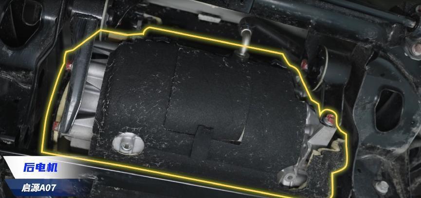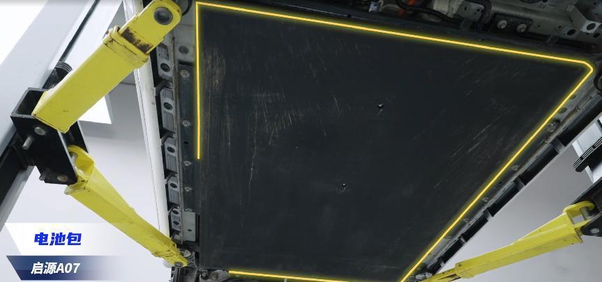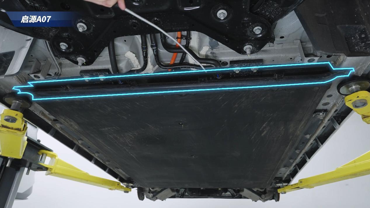 长安启源A07的电池前端有一根钢管进行防护,电池通过几字型钢材和底盘两侧连接,防护性相比小鹏MONA M03采用的加强梁要弱一些。电池端子两侧有防爆阀,并且有金属钢板遮挡,避免出现意外时,高压高温气体直接对电机造成损伤。