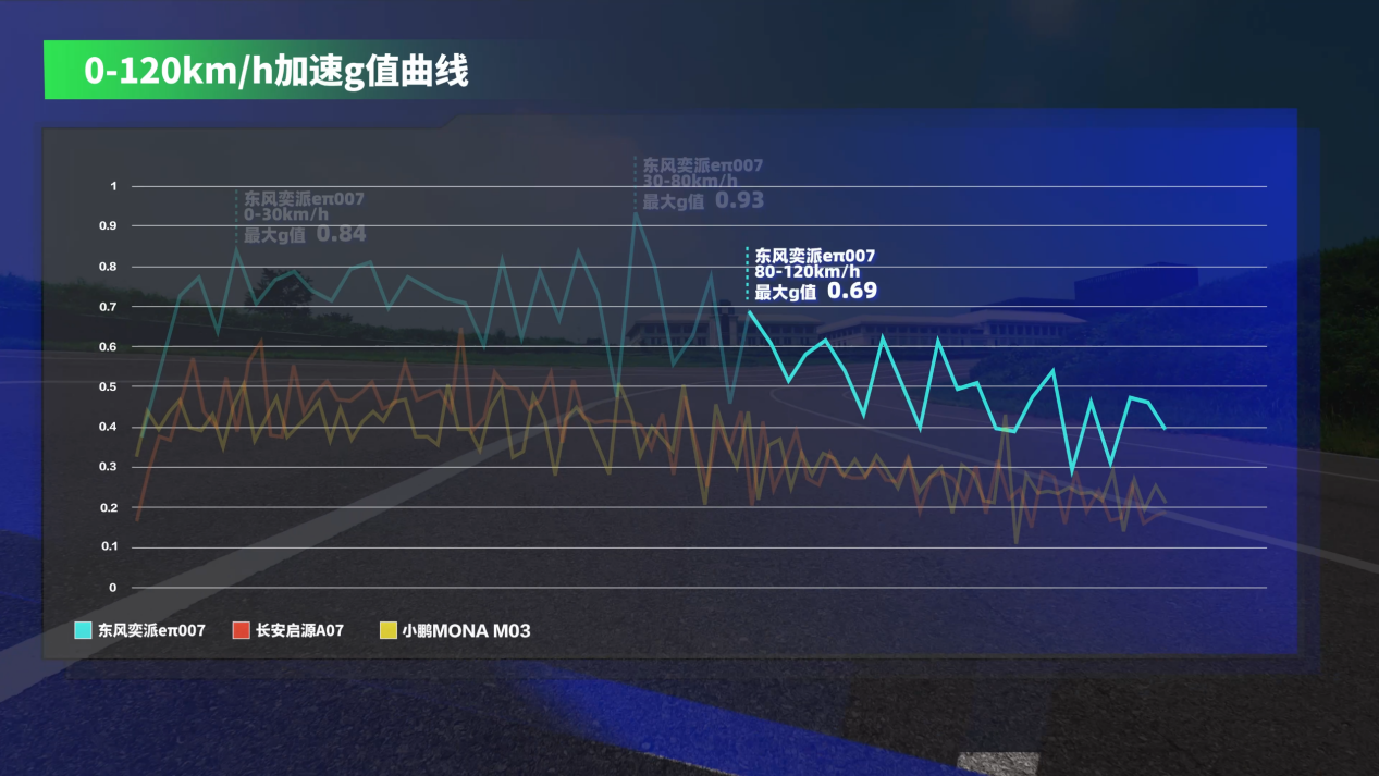 中段加速东风奕派eπ007的G值不降反升,在30-80km/h区间竟然达到0.93G的峰值。想象一下,在城市高架上,你轻点电门就能干净利落超车,不再有传统电动车后段疲软的遗憾。
