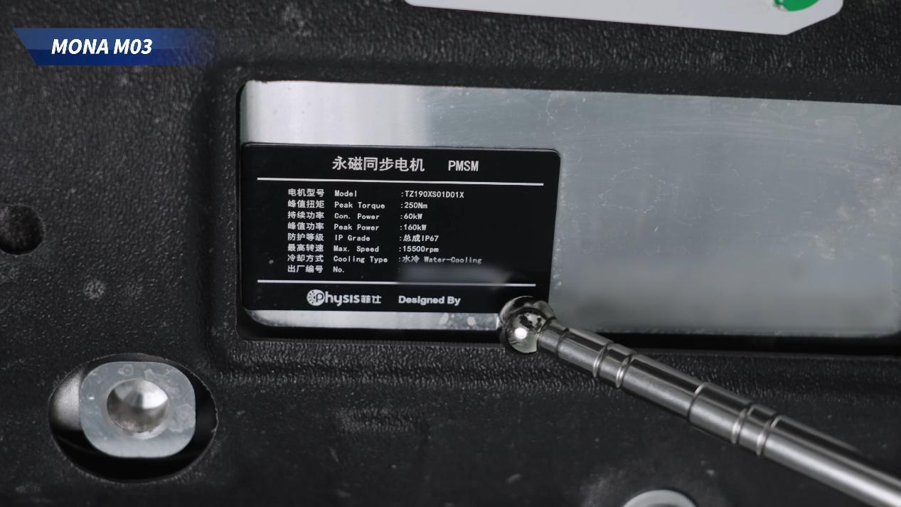 接着我们来到新能源车的专属核心部分,电池电机。小鹏MONA M03采用菲仕提供的永磁同步电机,总功率160kW。其电池来自于比亚迪旗下的弗迪刀片电池,采用磷酸铁锂构型,容量62.2kWh。