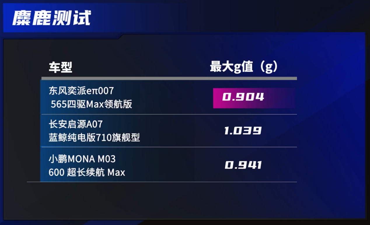 三台车的测试成绩如图,麋鹿测试标准为iso3888-2。成绩中的横向G值代表车辆变向时产生的离心力,但高G值不等于高操控极限,恰恰相反,这是一个接近车辆极限的信号。