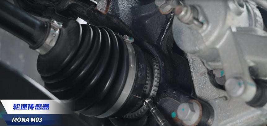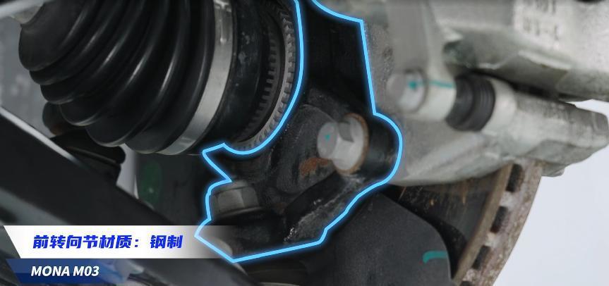 三角臂材质采用的是普通双层冲压钢板,看上去比较粗壮结实。转向节同样采用钢制,但轮速传感器的齿圈是外露的,进入异物后容易损坏。