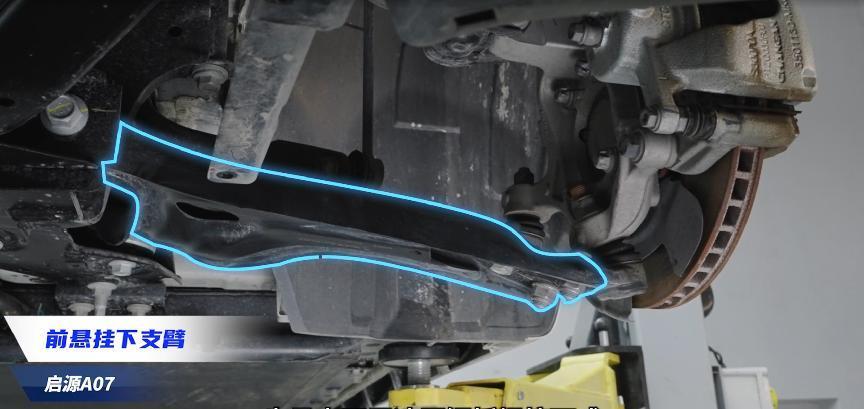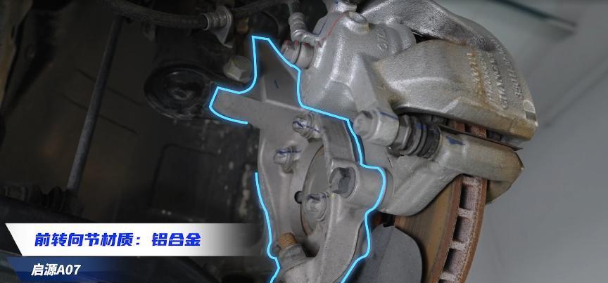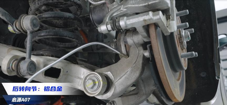 长安启源A07采用的是半全框混合结构工艺,U型支撑+封闭连接,结构创新;三角臂材质依然为普通双层冲压钢板,但前后转向节采用铝合金材质,能有效降低簧下质量,轮速传感器采用磁性封闭式传感器,防泥沙冰水侵蚀,环境适应能力更好。簧下质量更低有三个方面的优势,首先是操控响应更灵活,就像穿跑鞋比厚重军靴;其次是舒适性,较轻的悬挂部件能更快吸收震动;最后是轮胎抓地力,过坎时轮胎能更快重新贴地。