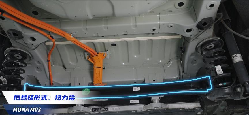 小鹏MONA M03的悬挂类型是前麦弗逊独立悬挂+后扭力梁非独立悬挂,后扭力梁中央扭杆是双层冲压封闭钢板构成的封闭形式,代替后副车架的功能,刚才我们也讲到了这类悬挂的特性,一侧颠簸会牵连另一侧,舒适性会有一些影响。