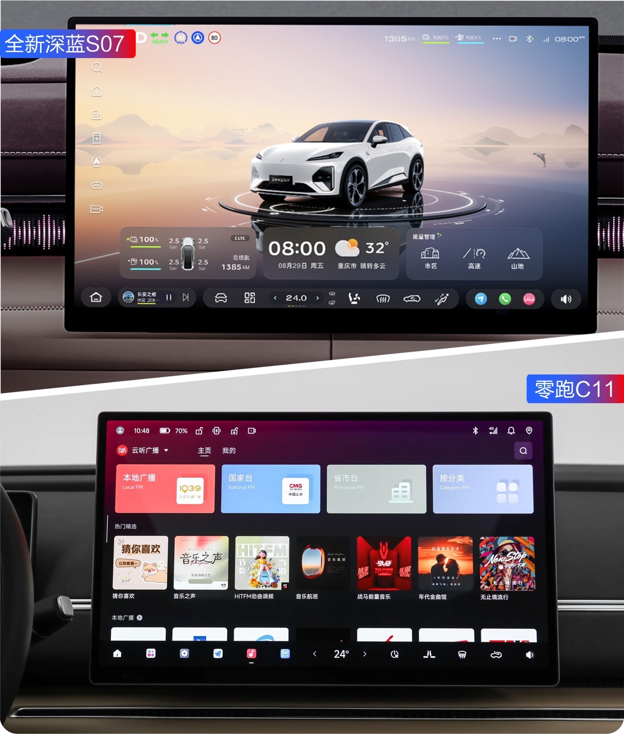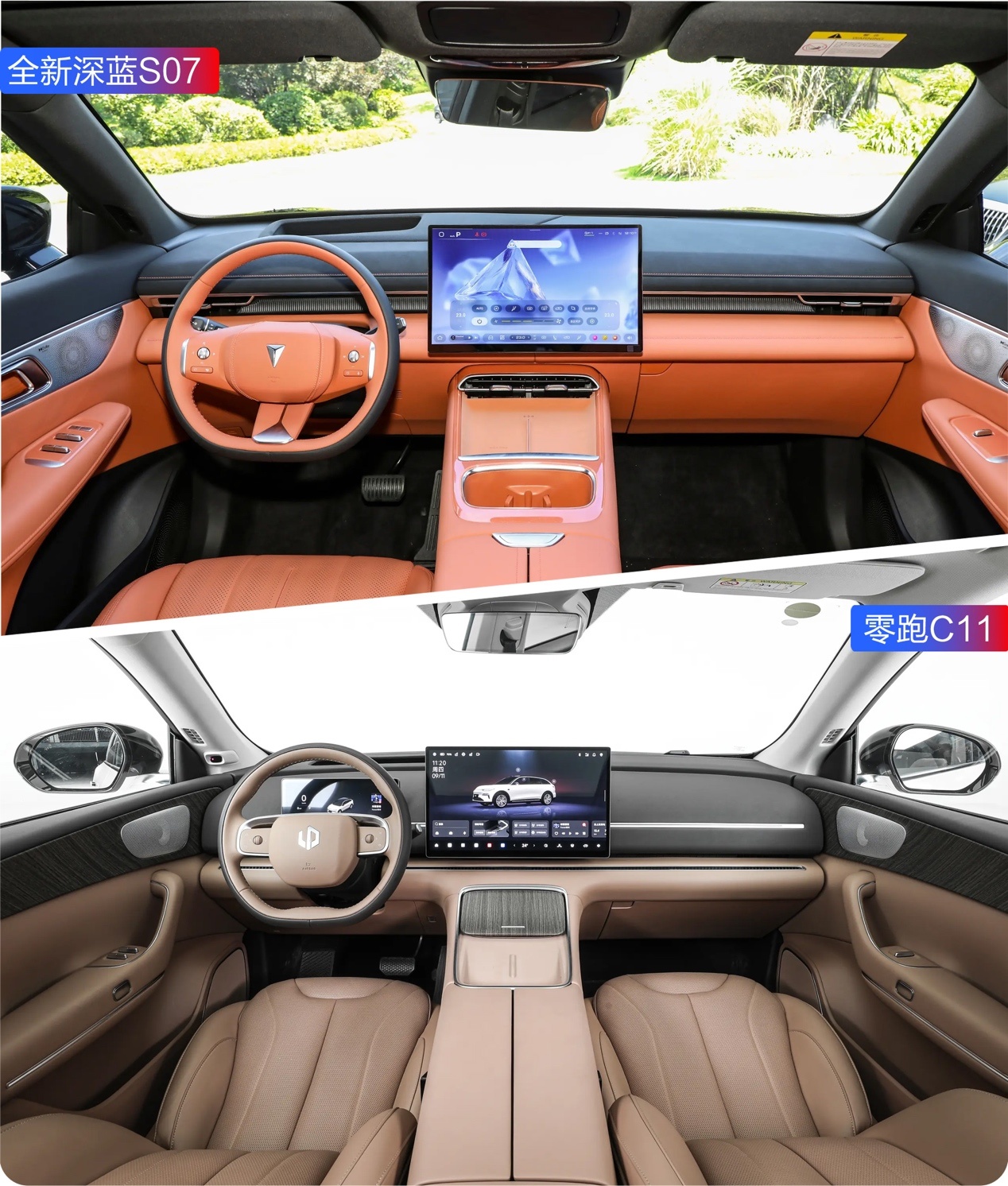 两车都配备了大尺寸中控屏,全新深蓝S07是15.6英寸向日葵屏,偏转角度遵循人体工学原理的最佳视角范围,在智能模式下可随场景自动执行偏转,实现迎送宾场景,更显尊崇。零跑C11要大一点,为17.3英寸,但是不能调节角度。两车都搭载了高通骁龙8295P芯片。车机部分,全新深蓝S07的DEEPAL OS 4.0智能操作系统支持多种AI大模型,以深蓝品牌LOGO为设计灵感打造的AI语音形象提供了充足的情绪价值,让车机不再冷冰冰。