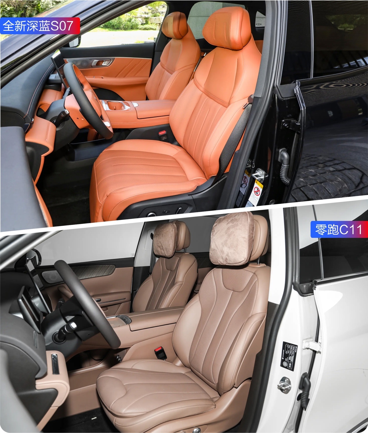 全新深蓝S07副驾配备的14向调节零重力座椅、主驾可选装的16向调节零重力座椅,支持120°平躺,除了加热、通风之外,还有8种模式3种强度的按摩功能,石墨烯加热、理疗为用户带来全天候的舒适体验,大幅缓解驾车时的疲劳。零跑C11的主驾座椅功能也比较齐全,只可惜少了零重力模式,在停车休息时还是不如全新深蓝S07舒服。