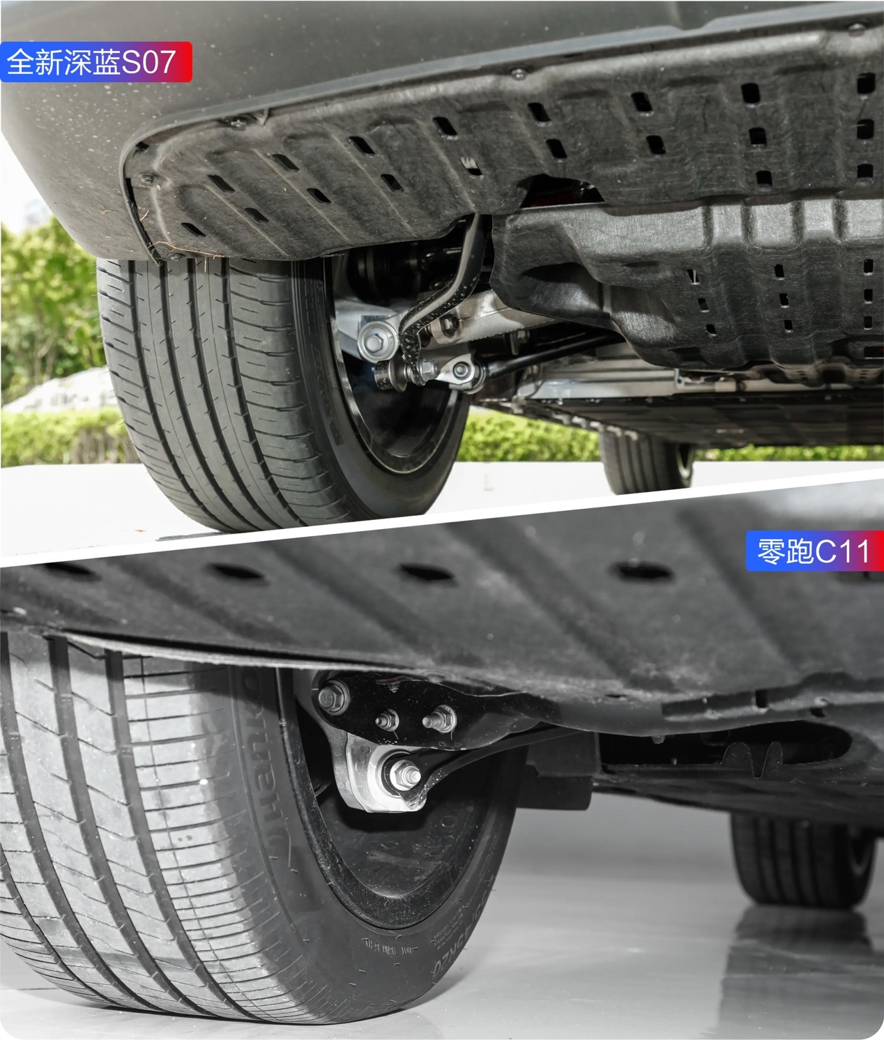底盘方面,全新深蓝S07使用前麦弗逊后多连杆结构,全系标配FSD+HRS可变自适应悬架令车辆刹车不点头、过完不侧倾、烂路不颠簸,舒适性和操控性都更好。零跑C11使用的是前双叉臂后五连杆结构悬架。