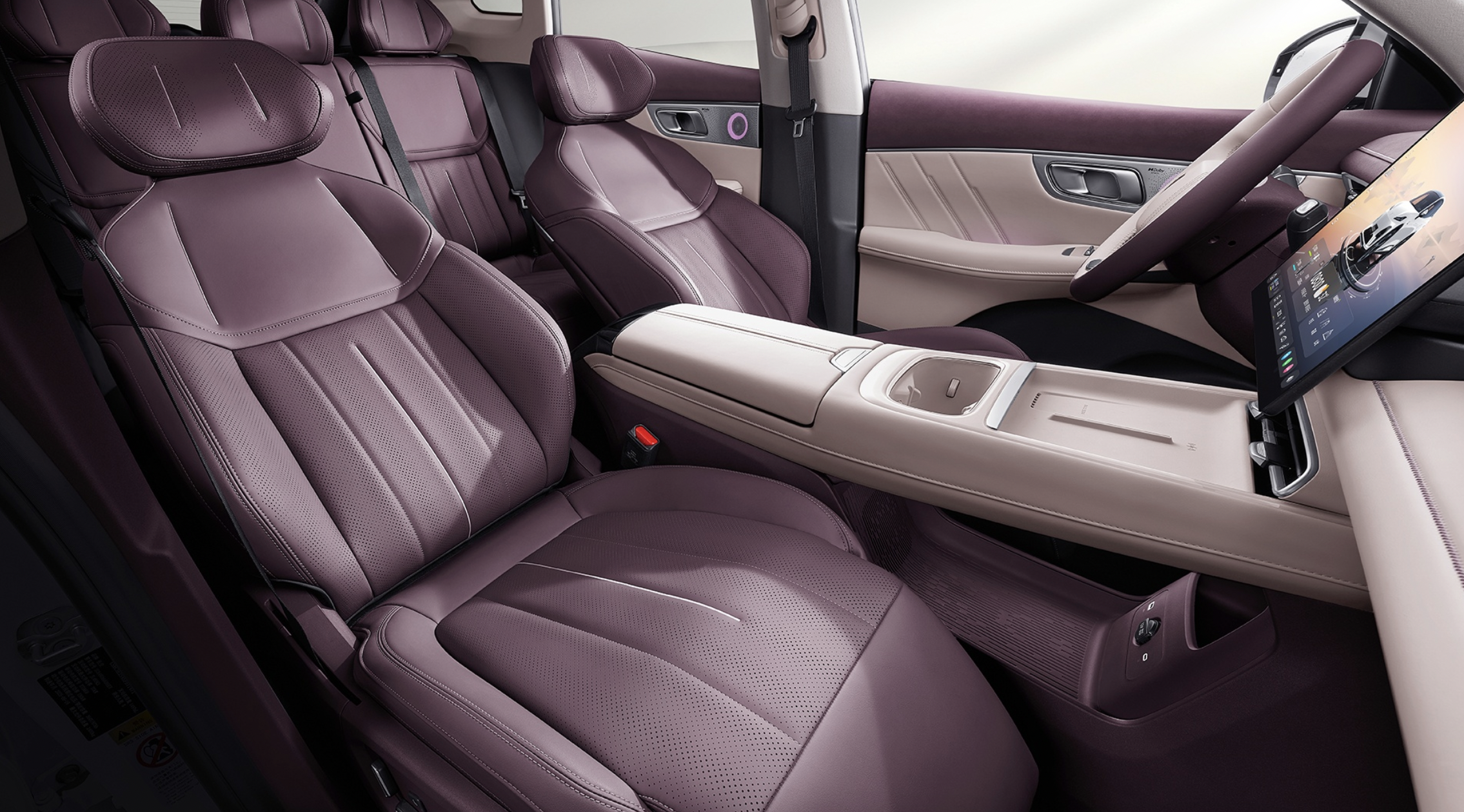 进到车内,两车的整体设计有相似之处,都是简洁的科技风,通过横向布局来提升车内的视觉宽度和通透感。但是在材质和做工上有着明显的区别,全新深蓝S07全车软包面积达到10.7㎡,上门板和上仪表盘都100%使用超纤绒感麂皮包覆,不论视觉还是触觉都更豪华。新增的暮烟紫内饰颜色将豪华感提升到了新的高度。