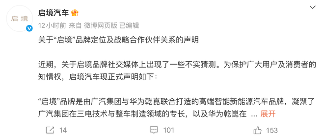 启境汽车表示:为了让公众清晰理解这一品牌的内涵,我们倡导各界在传播中遵循严谨的品牌标识规范,以维护启境品牌的主体性及合作伙伴的合法权益。对于将“华为”与“启境”进行捆绑命名(如‘华为启境’、‘华为乾崑启境’)等容易引起误解或其他可能损害相关品牌合法权益的表述,应严格予以禁止。