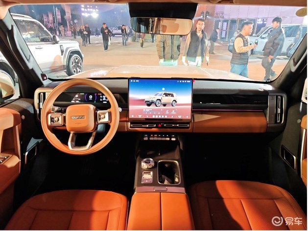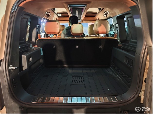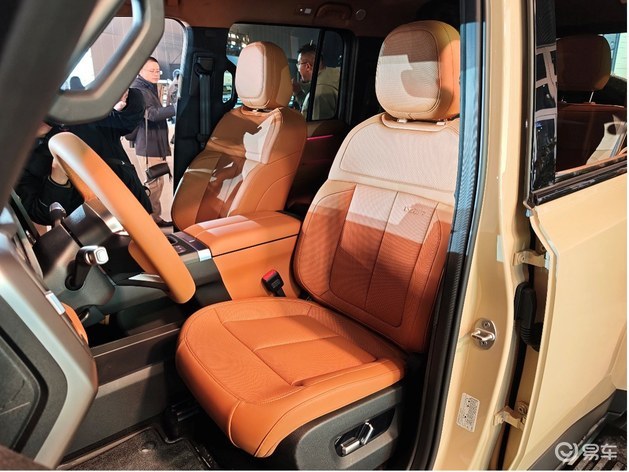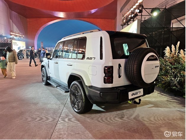 车门采用机械式外门把手,在保证耐用性的同时,也保留了硬派SUV应有的机械质感。轮胎方面,V27配备了专属定制的固特异265mm宽胎,搭配21英寸轮圈,进一步强化其硬派通过性。车顶行李架与侧面的防刮材质轮眉,则暗示着它随时准备应对户外复杂路况。