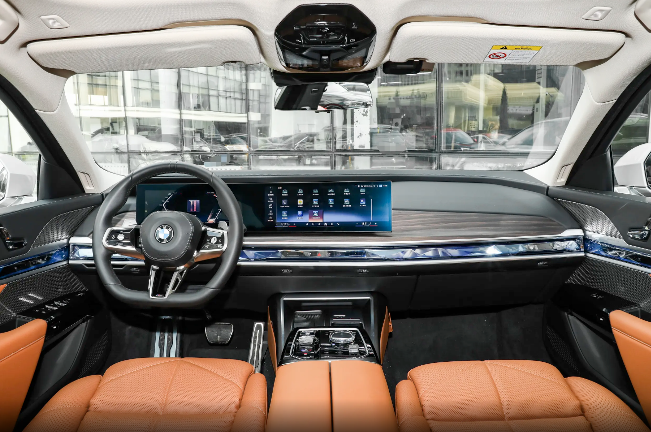 步入车内,两款车的座舱设计也有较大差异。宝马7系延续了品牌以驾驶者为中心的设计理念,12.3英寸全液晶仪表与14.9英寸中控屏组成的曲面双屏系统科技感十足,同时台面采用了木纹饰板、水晶贯穿灯带和软包材质组合,保证了旗舰级车型的豪华质感。宝马的iDrive系统依旧流畅易用,但对于一款豪华旗舰车型来说,缺少了一些让人惊艳的元素。