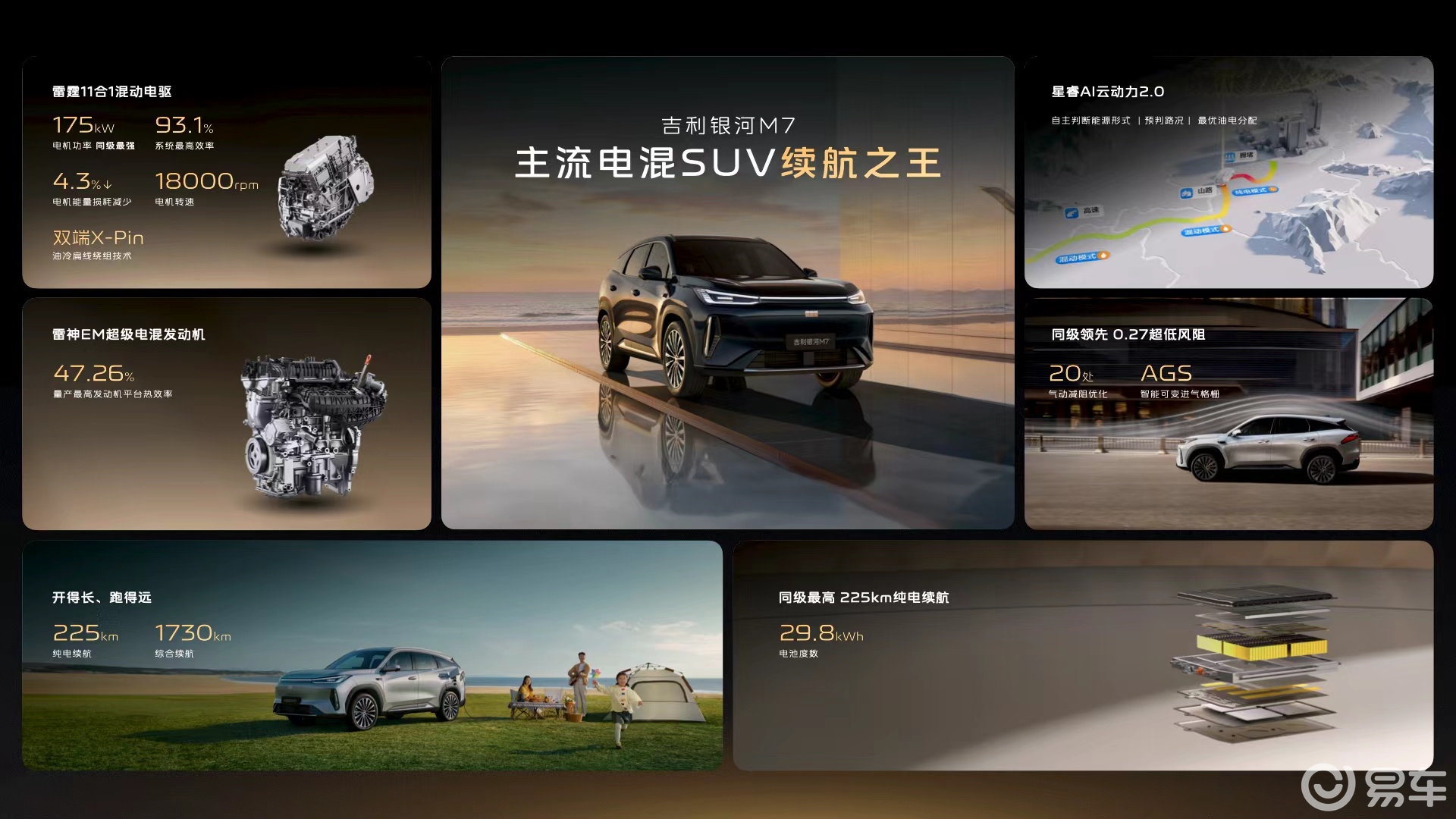据介绍,定位“主流电混SUV颠覆者”的银河M7,搭载的29.8kWh混动专用电池包,电池容量较同级高出约12%;搭配系统最高效率达93.1%的雷霆11合1高集成电驱,可实现高达225km的纯电续航,对于城市通勤用户可满足“一周通勤零油耗、零充电”;依托热效率高达47.26%的雷神EM超级电混专用发动机,银河M7可实现1730km综合续航和3.35L/100km的超低馈电油耗。