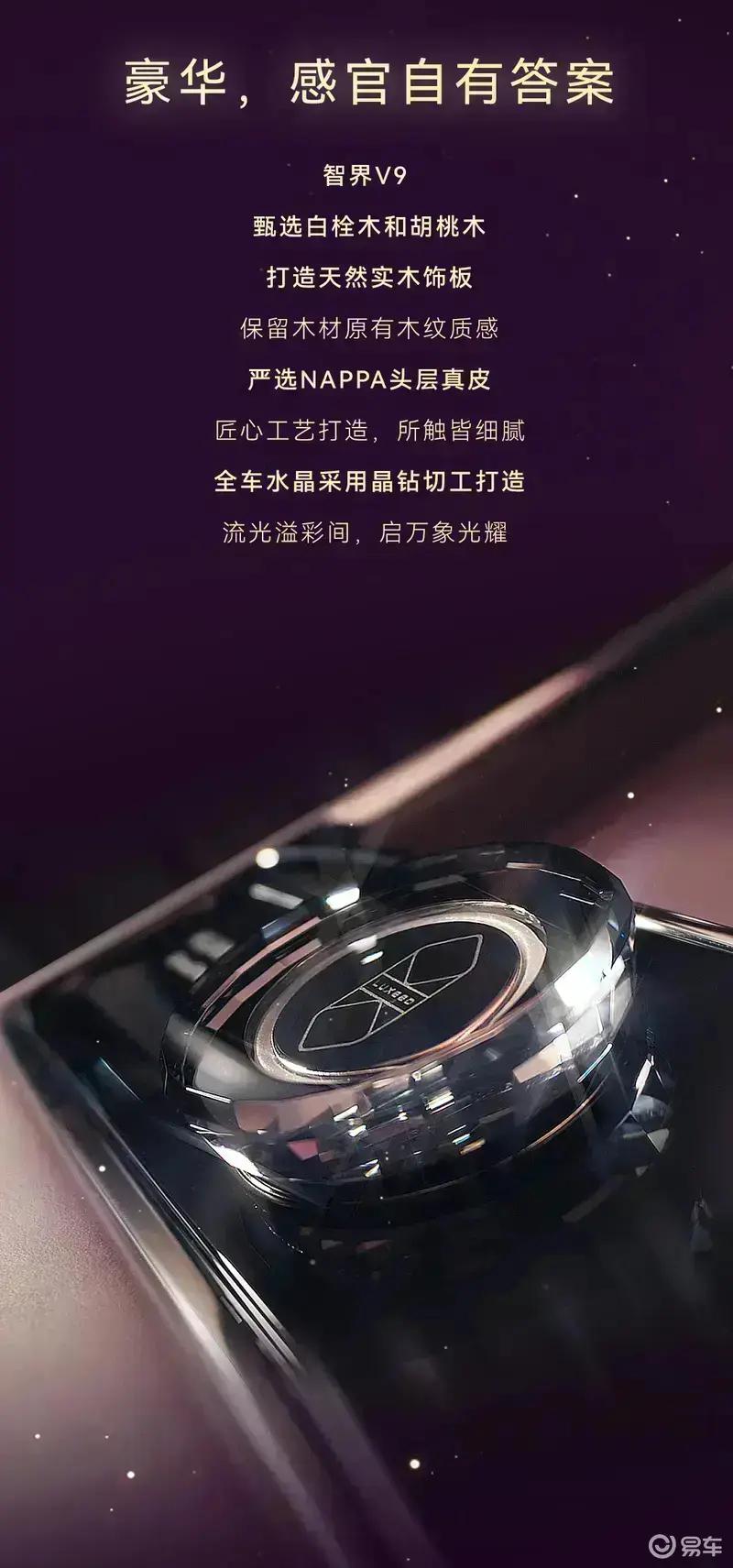 智界V9首发绒霞紫内饰,选用天然实木、NAPPA头层真皮与晶钻切工水晶等高端材质,豪华质感拉满。此外,新车还搭载二排旋转座椅、太空舒躺模式及零重力座椅模式等智能科技配置。