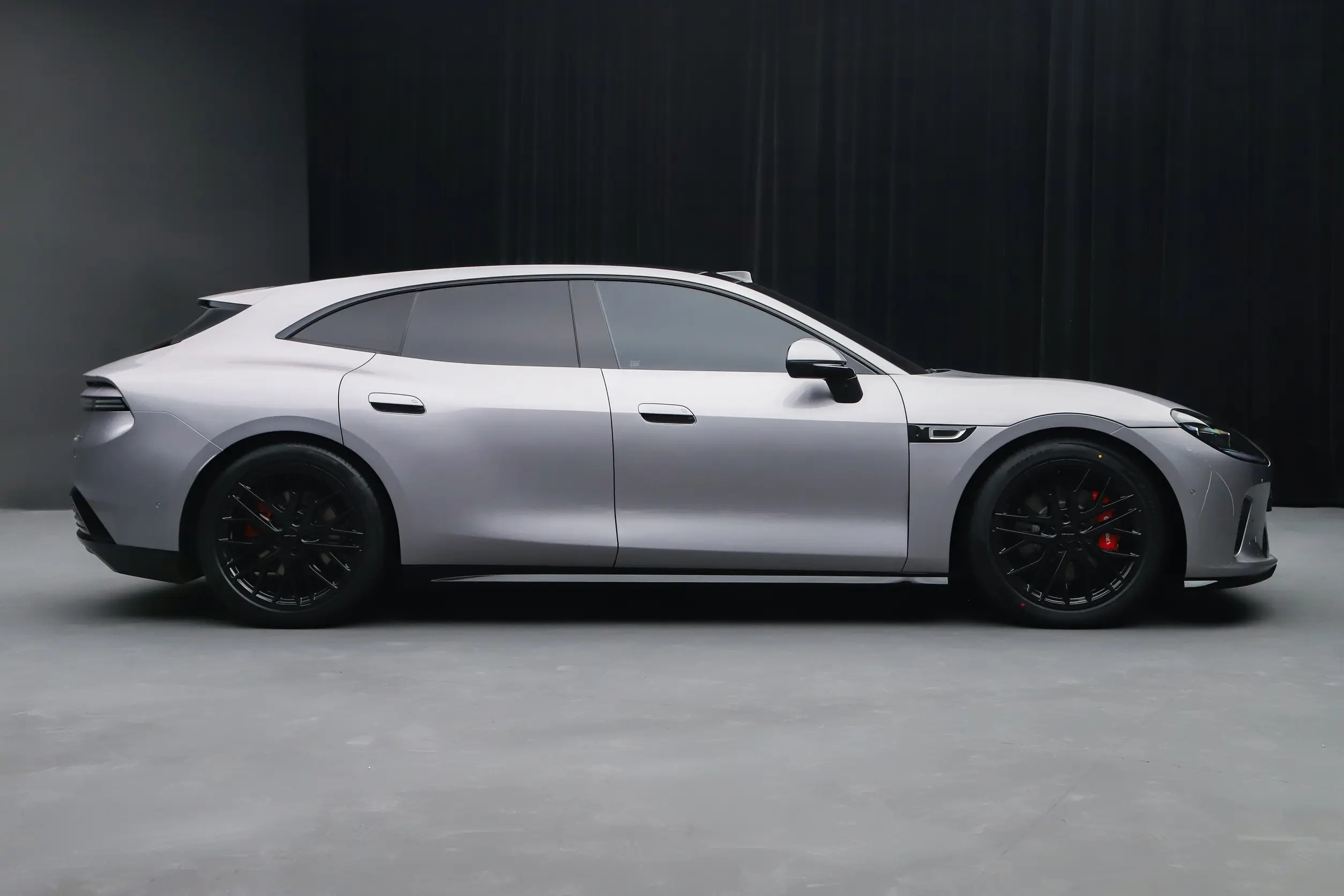 外观延续极氪9X的设计风格,溜背造型搭配贯穿式尾灯,车身线条流畅,新增专属车身配色,质感十足;车身侧面采用隐藏式门把手,大尺寸轮毂搭配红色刹车卡钳,运动感拉满。